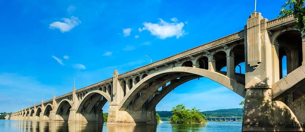 This state has many interesting geographical feature from Lake Eerie to the North and the Appalachian Mountain Range on its eastern side and is known to have severe weather including annual tornadoes, making the need for constant reconstruction necessary. The Columbia-Wrightsville Bridge is technically named the Veterans Memorial Bridge and spans 6,657 feet across the Susquehanna River between the towns of Columbia and Wrightsville. Built in 1930, it was designed by James B. Long and constructed by Glen Wiley and Glenway Maxon. The concrete deck arch bridge carries two lanes of Pennsylvania Route 462 and is comprised of 100,000 cubic yards of concrete and eight million pounds of steel with 27 river piers and 22 approach piers.